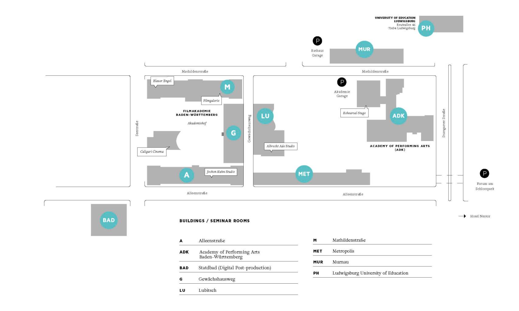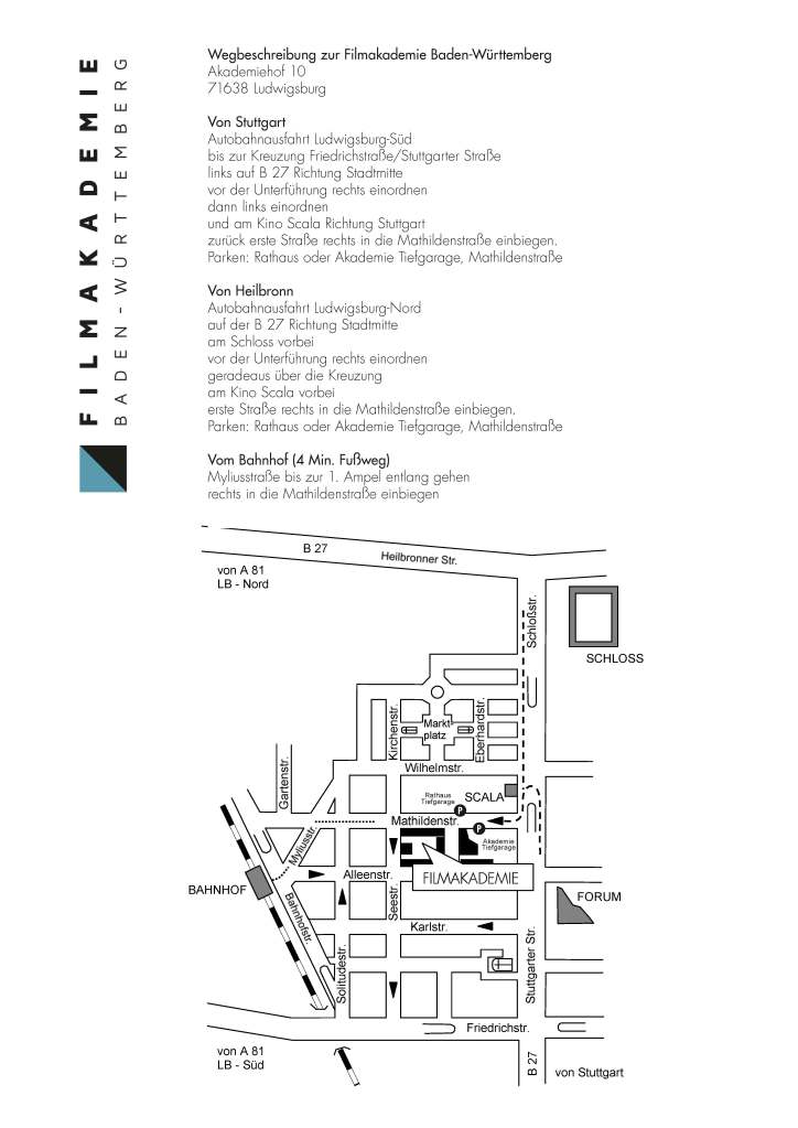 Filmakademie Baden-Württenberg (FABK) is situated in Ludwigsburg, 38 km from Stuttgart Airport and 14 km from Stuttgart Main Train Station. Frankfurt airport is 180 km away.